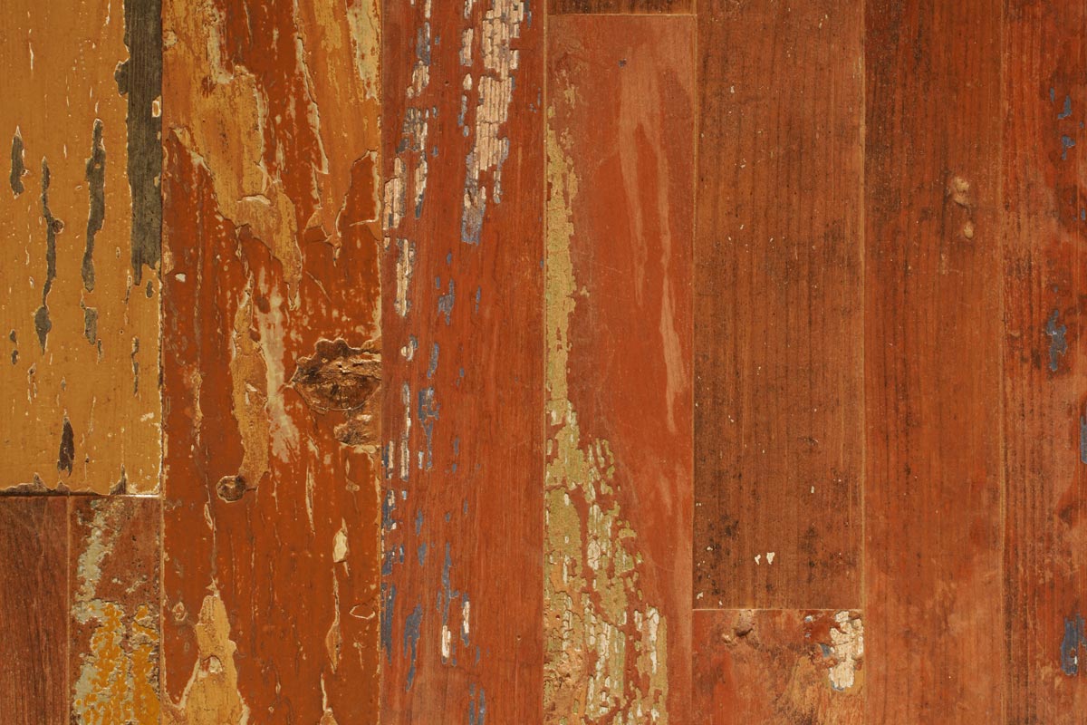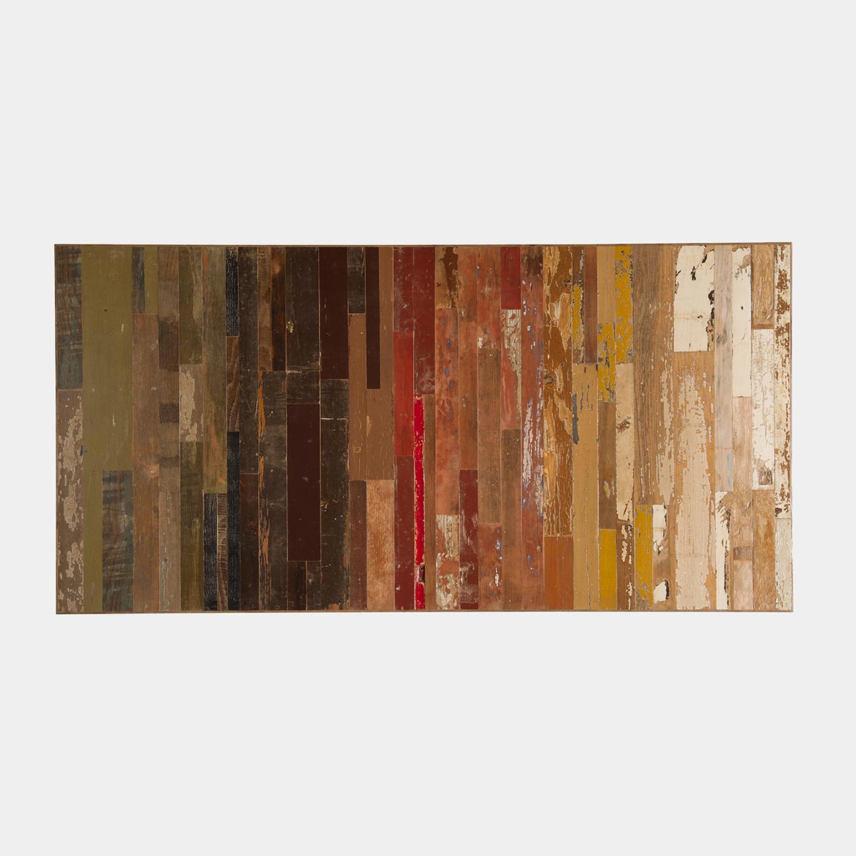 • Il piano è una composizione tipo puzzle di listelli di legno massello di recupero restaurato. I colori del piano sono un degradare composito da toni rosso intenso tipo lava, fino a toni più tenui e neutri (beige, miele, bianco sporto).