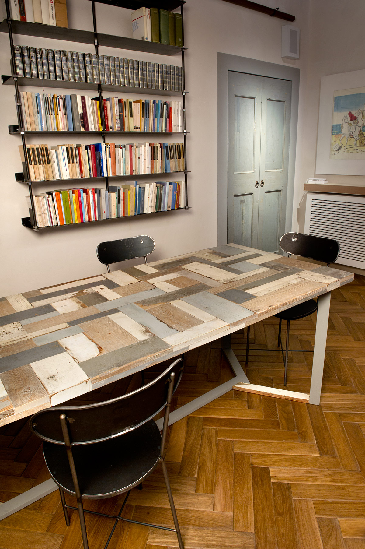Adoro la texture dei pezzi in legno di recupero, ed il loro contrasto con le parti di design