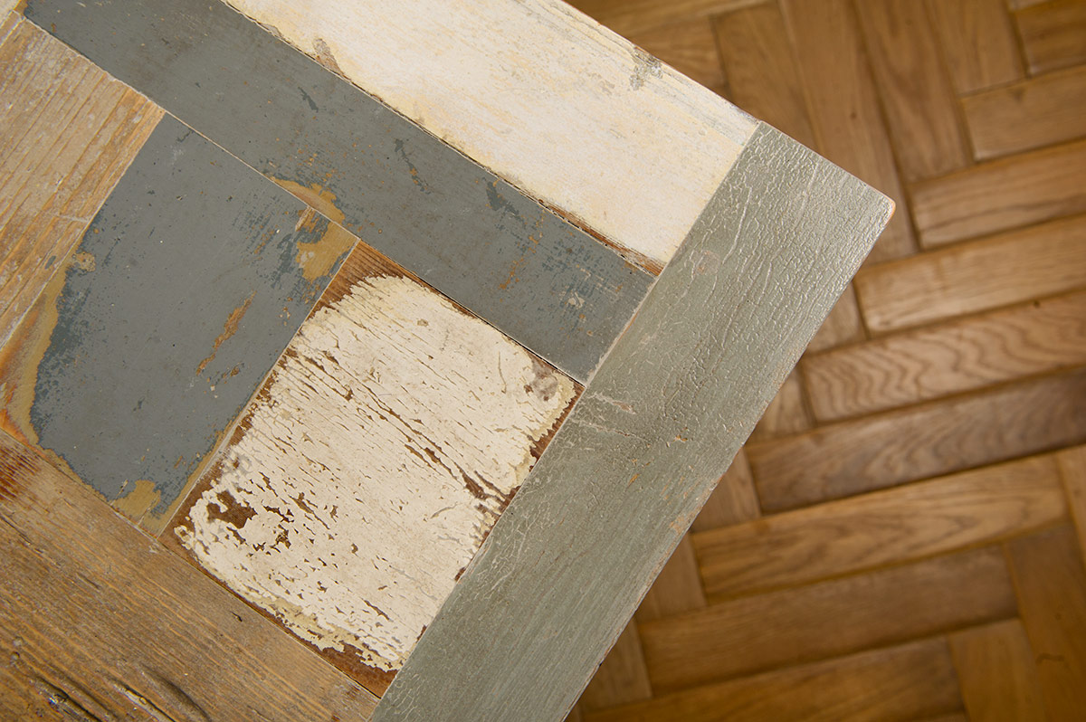 Il piano del tavolo è realizzato utilizzando un mosaico di legni di recupero, un dettaglio che distingue questo pezzo da molti altri tavoli nordici. Le tonalità fredde del legno – grigio, bianco e celeste ghiaccio – evocano i paesaggi scandinavi, dando vita a un design che è al tempo stesso fresco e accogliente. Ogni piccolo pezzo di legno è selezionato con cura e incollato con la tecnica della tarsia, che conferisce al tavolo un aspetto unico e artistico.