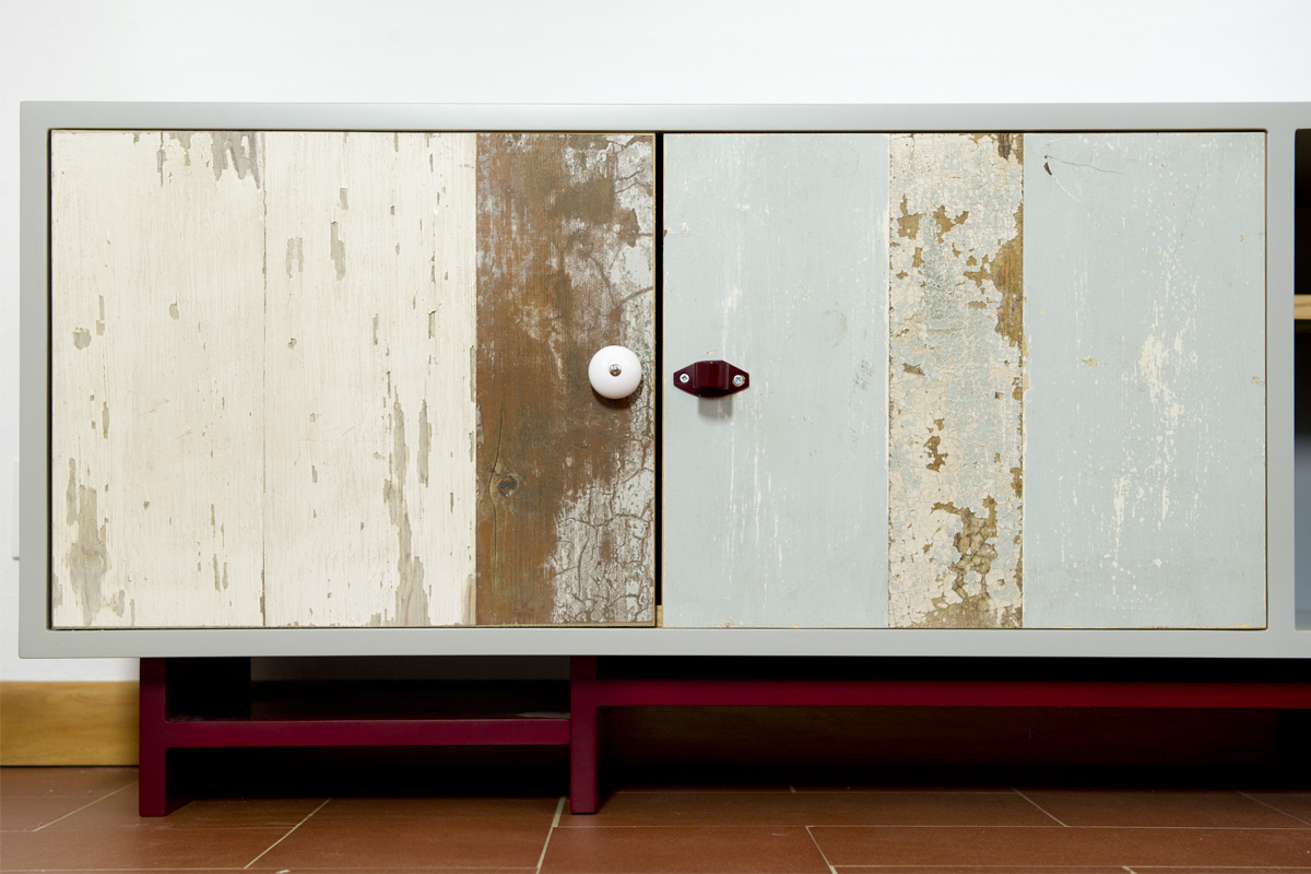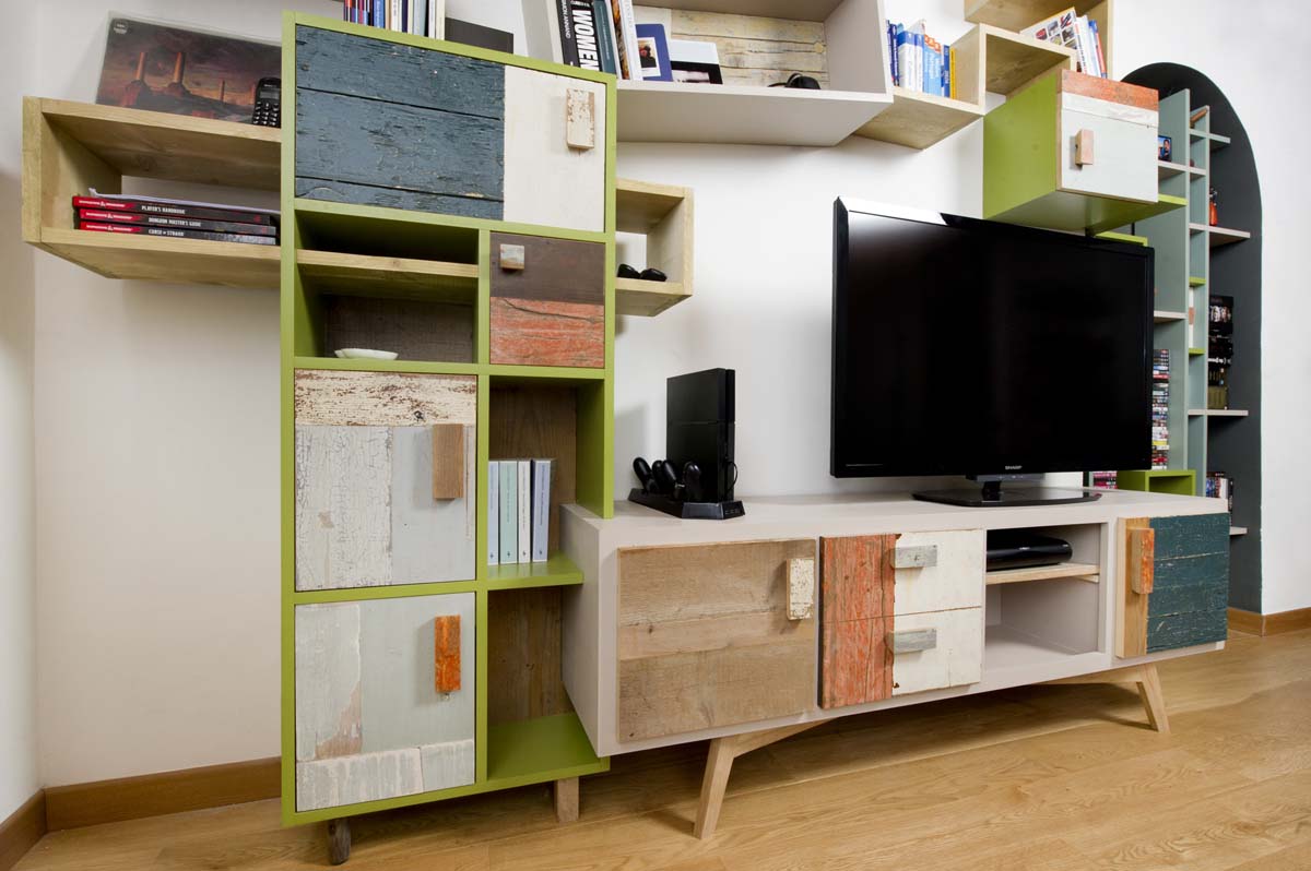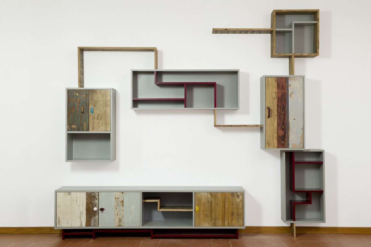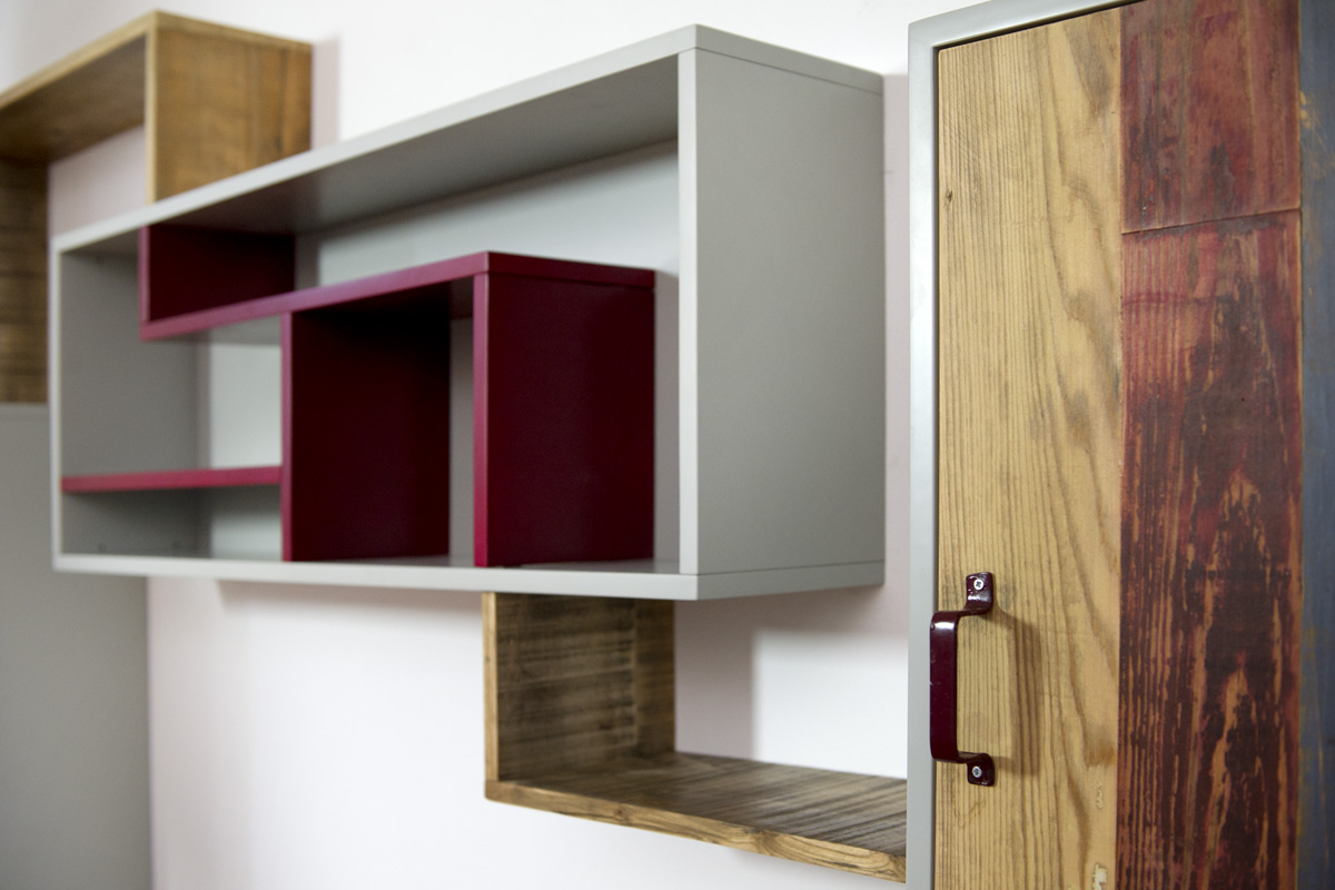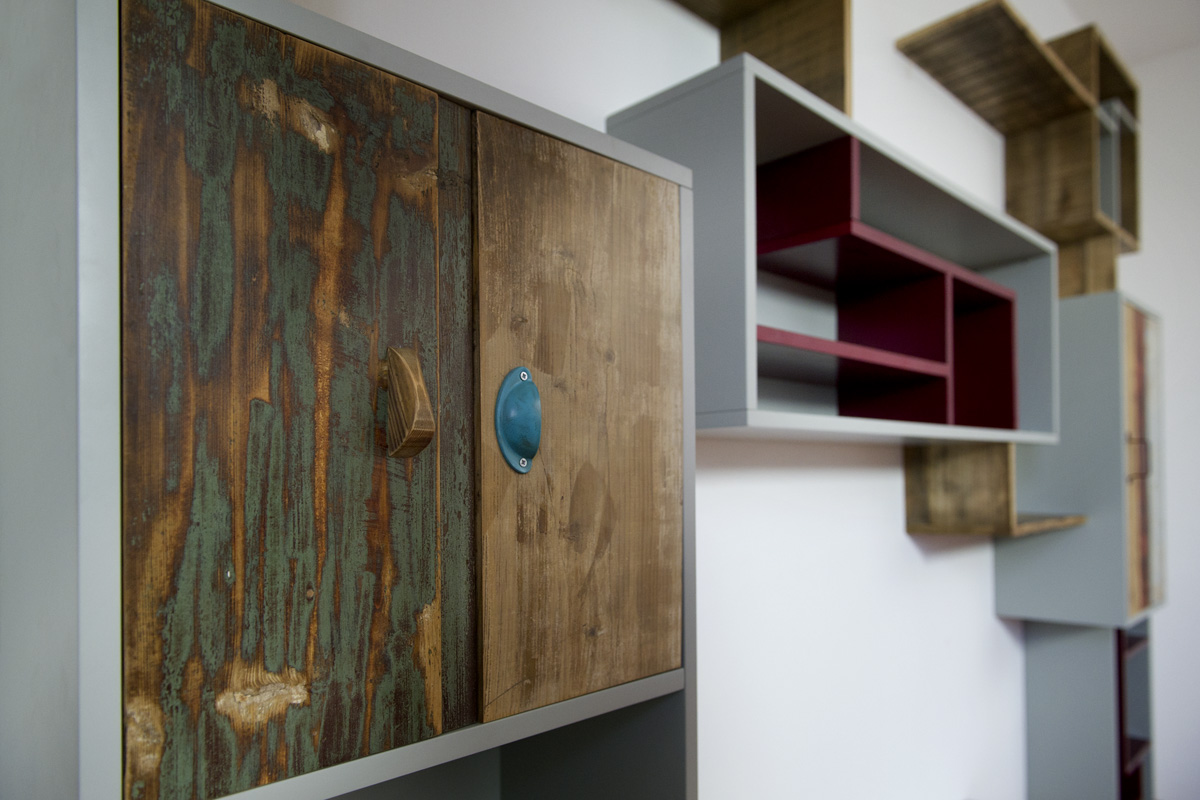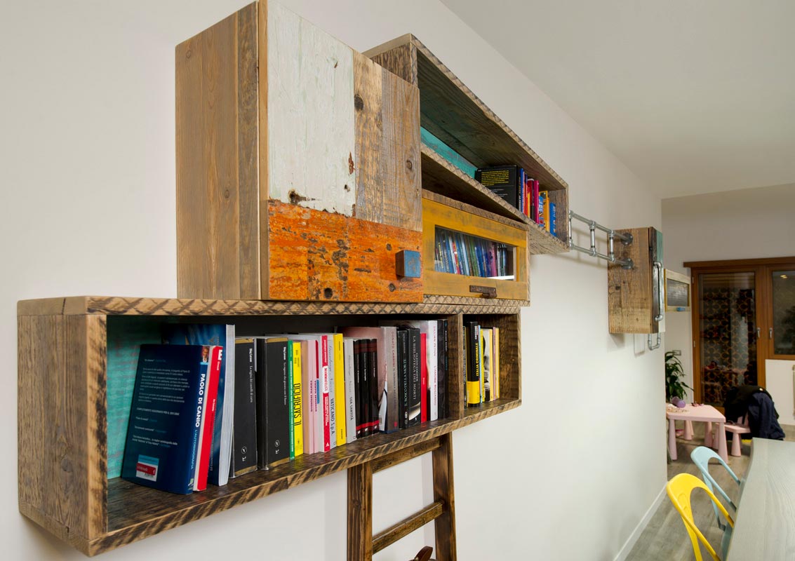 Anche qui utilizziamo diversi tipi di materiali, spaziando dal legno massello a quello di recupero, dai metalli fino alle stoffe. La struttura di queste libreria a giorno con moduli con sportelli in legno di recupero, può essere creata con tondini di ferro pieno ma anche con strutture in legno.