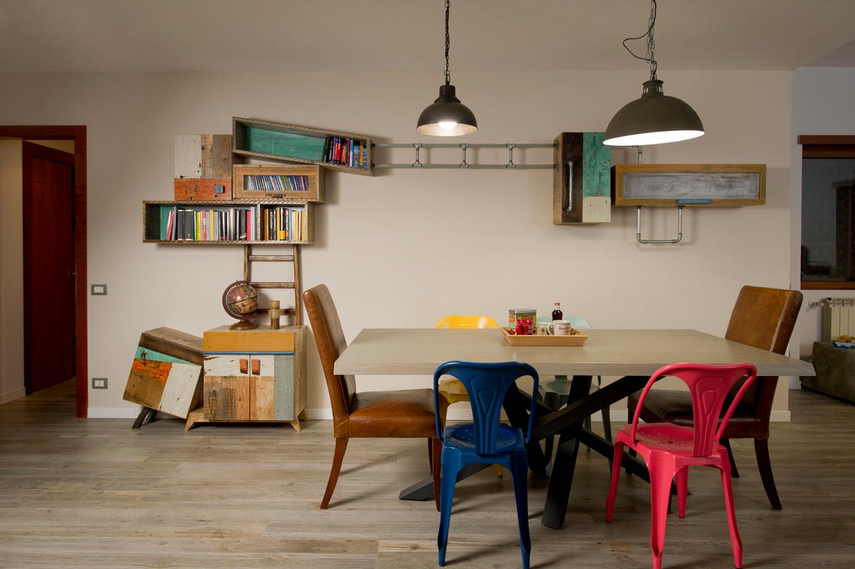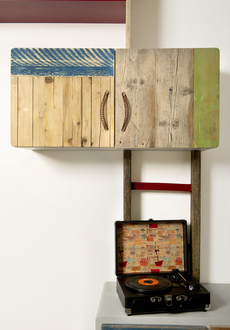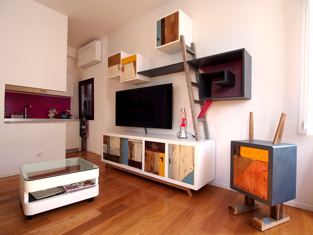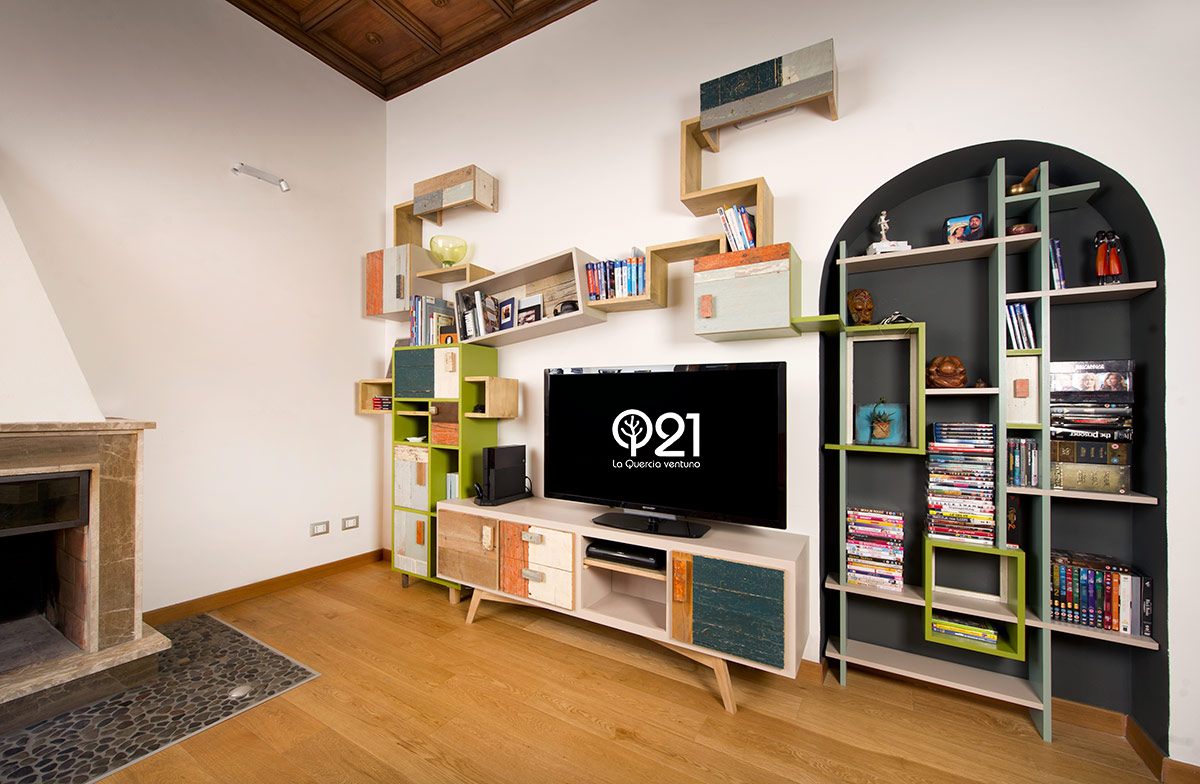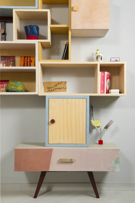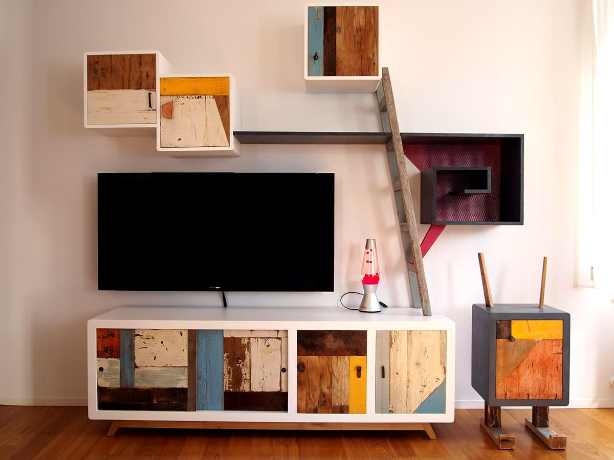 Anche qui utilizziamo diversi tipi di materiali, spaziando dal legno massello a quello di recupero, dai metalli fino alle stoffe. La struttura di queste libreria a giorno con moduli con sportelli in legno di recupero, può essere creata con tondini di ferro pieno ma anche con strutture in legno.