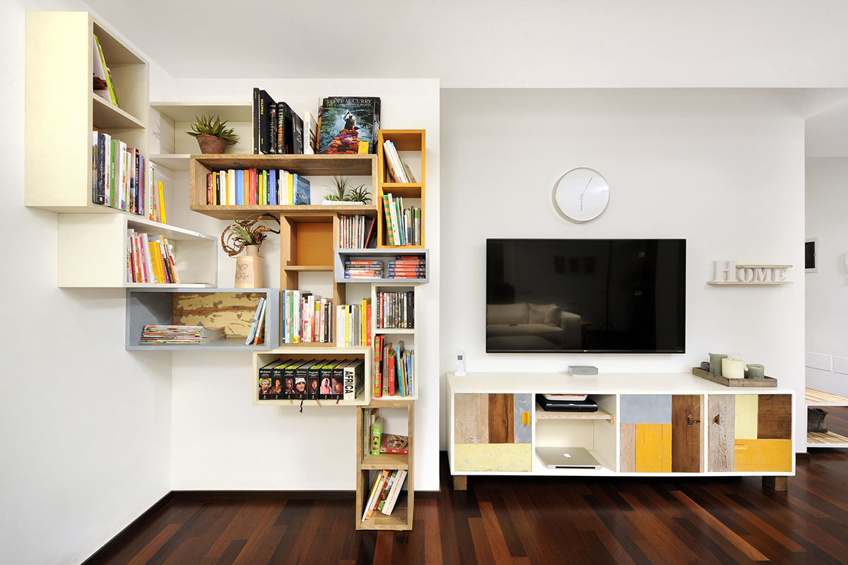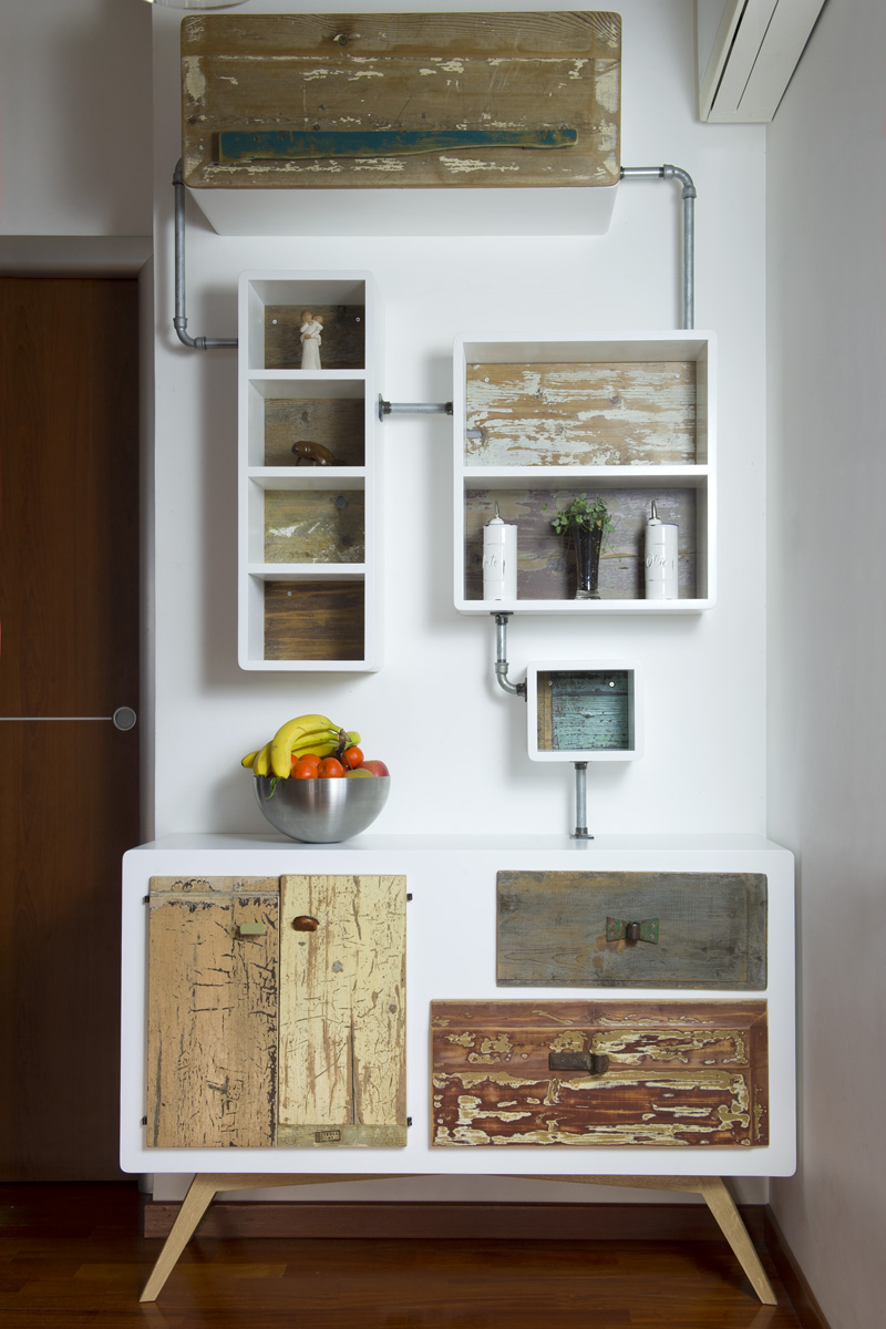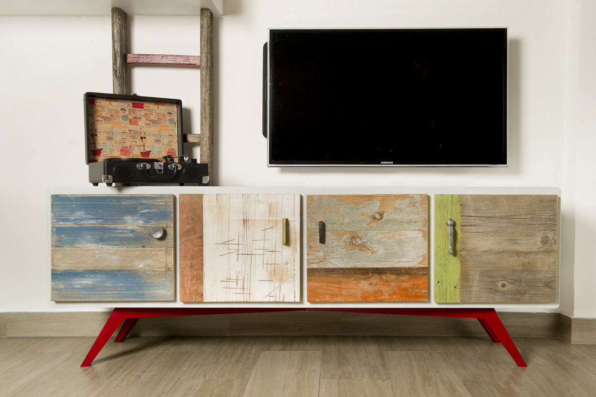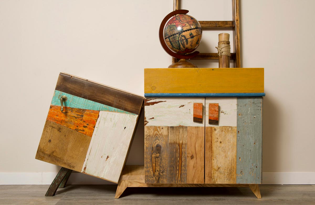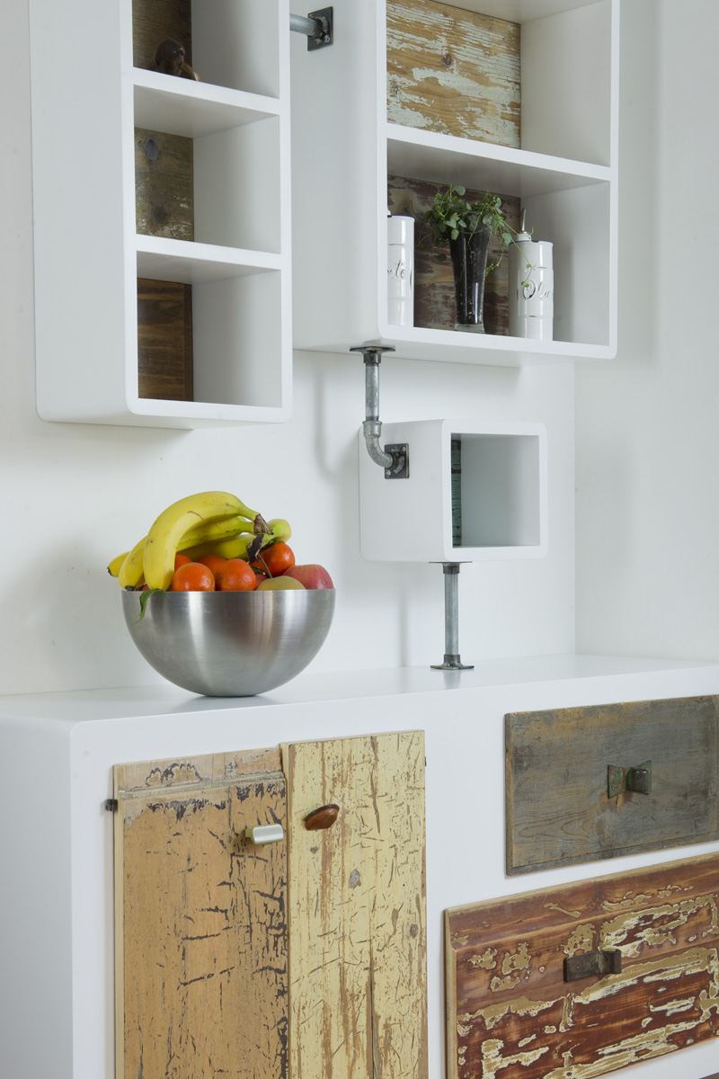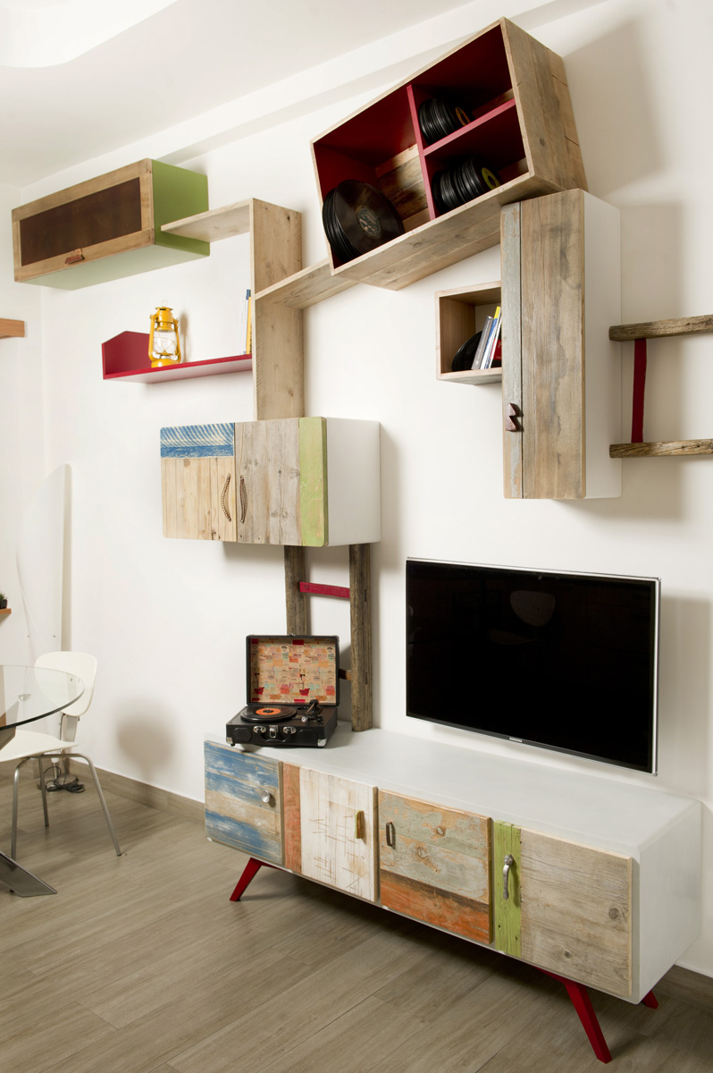 Anche qui utilizziamo diversi tipi di materiali, spaziando dal legno massello a quello di recupero, dai metalli fino alle stoffe. La struttura di queste libreria a giorno con moduli con sportelli in legno di recupero, può essere creata con tondini di ferro pieno ma anche con strutture in legno.