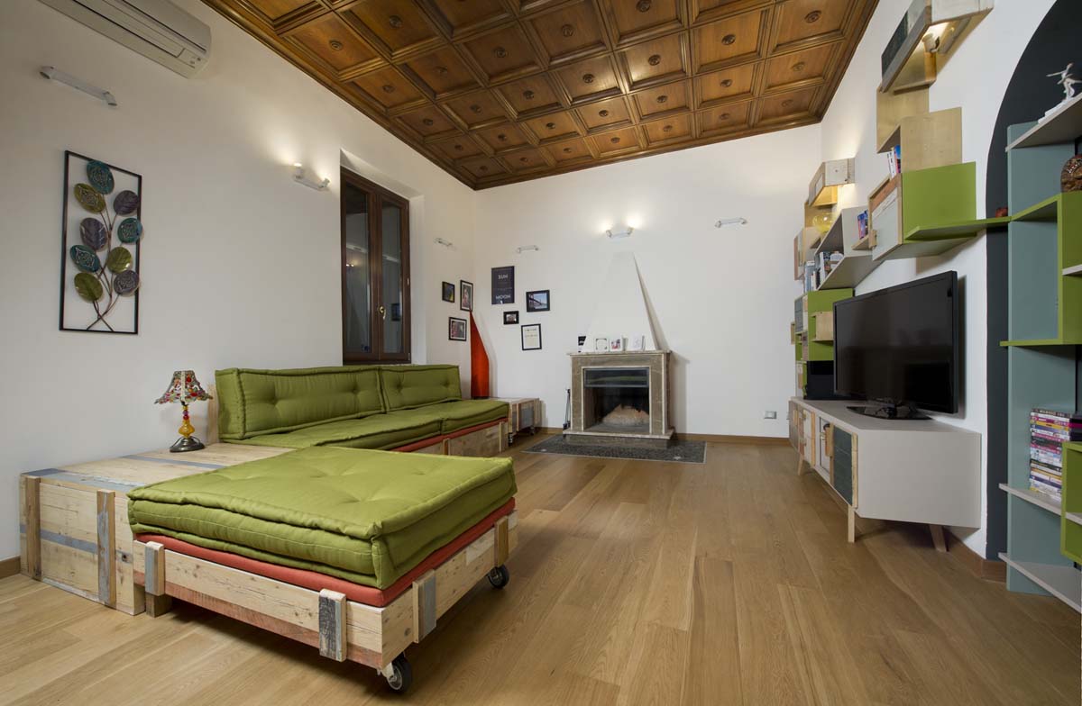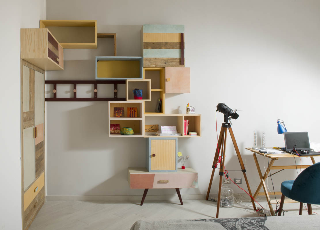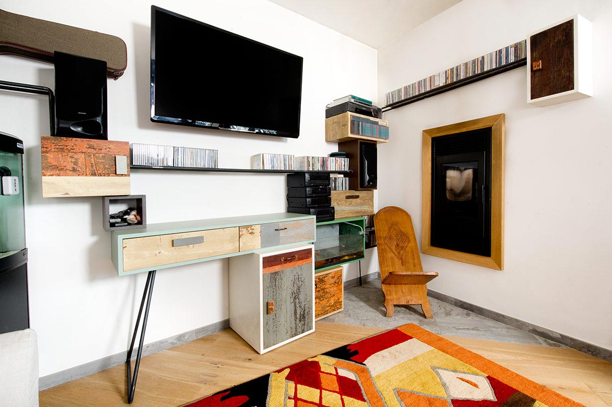 La parete attrezzata per ufficio è progettata in modo da essere flessibile e adattabile a qualsiasi spazio, rendendo l’angolo di lavoro un tutt’uno con il resto dell’arredo del soggiorno. La combinazione di legno grezzo, lamiere colorate e dettagli in ferro crea un’atmosfera contemporanea, perfetta per un ambiente multifunzionale come l’ufficio in casa.