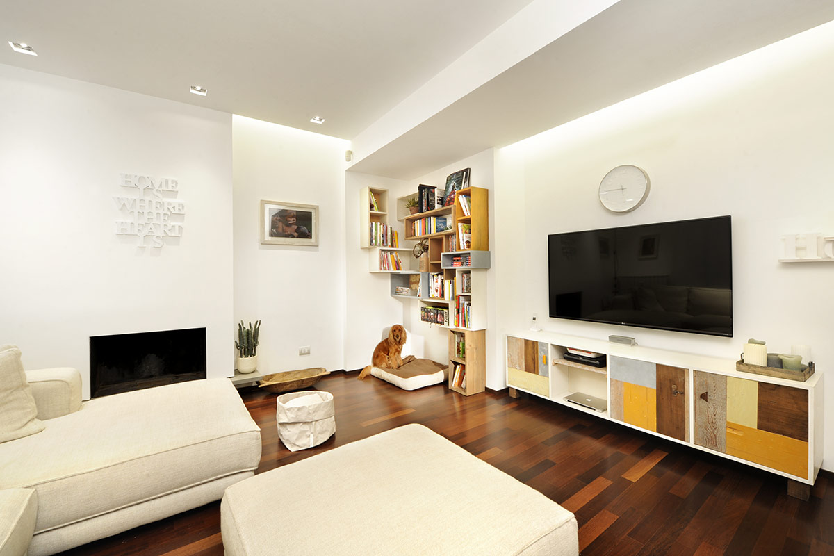 La versatilità del bianco e legno permette di integrare diversi moduli: mensole sospese, vetrine, cassetti e vani per la televisione. Questa combinazione si adatta perfettamente a qualsiasi stile di soggiorno, dal più classico al più contemporaneo, garantendo un risultato accogliente e armonioso.