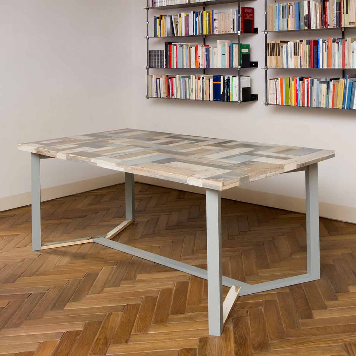 Il legno riciclato può essere anche utilizzato per costruire le gambe e gli altri elementi strutturali del tavolo, per avere un mobile al 100% ecosostenibile ottenuto da materiali di recupero.