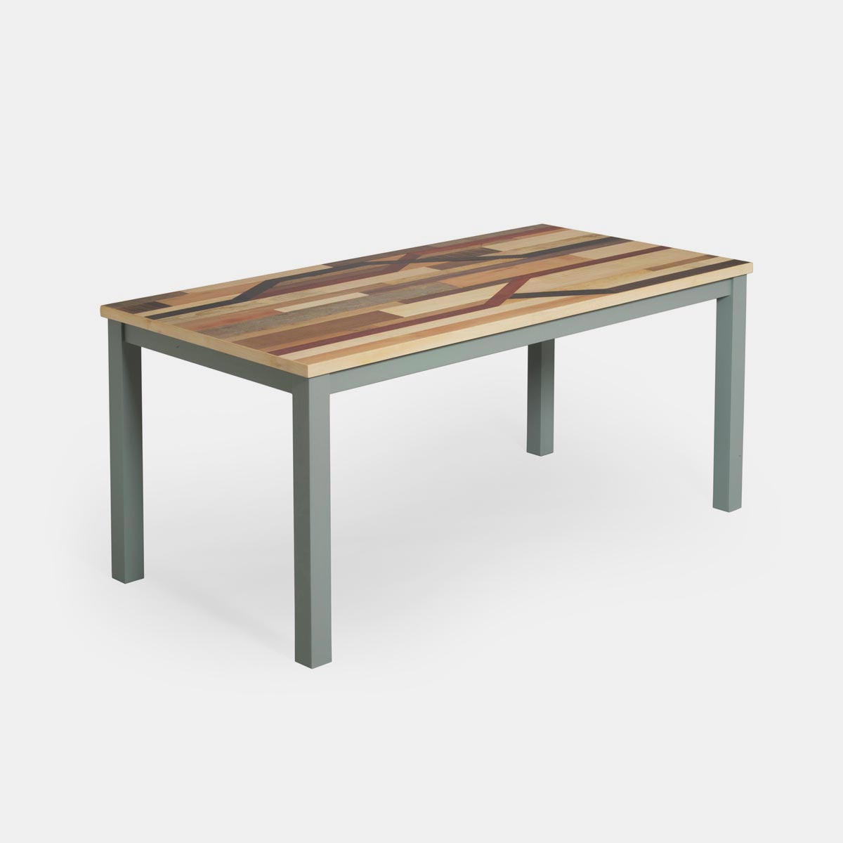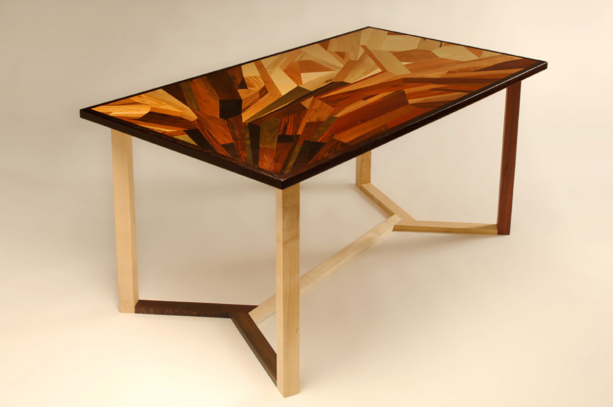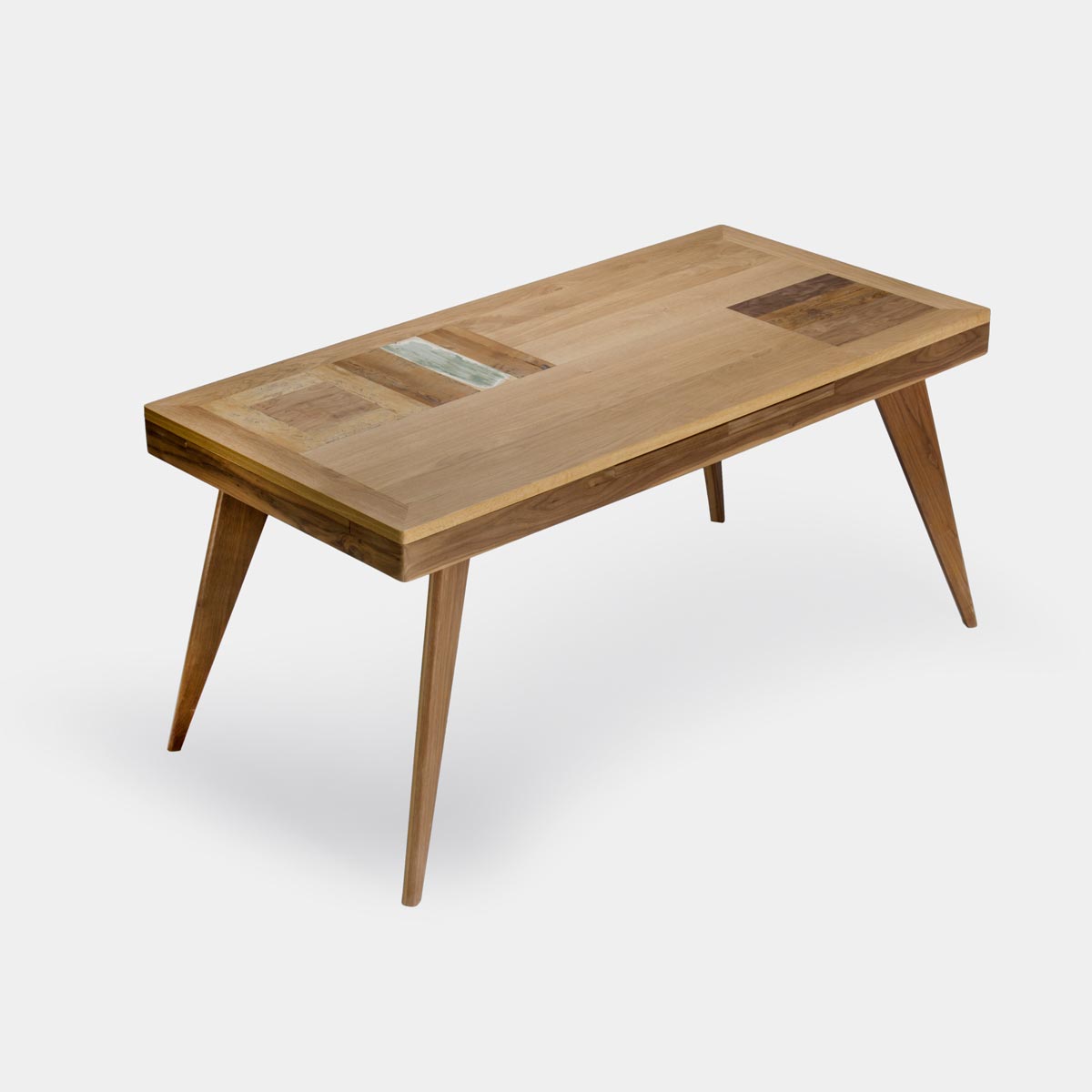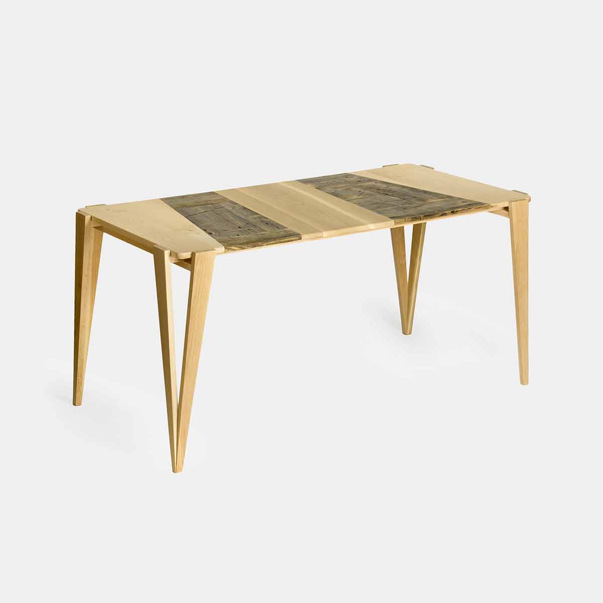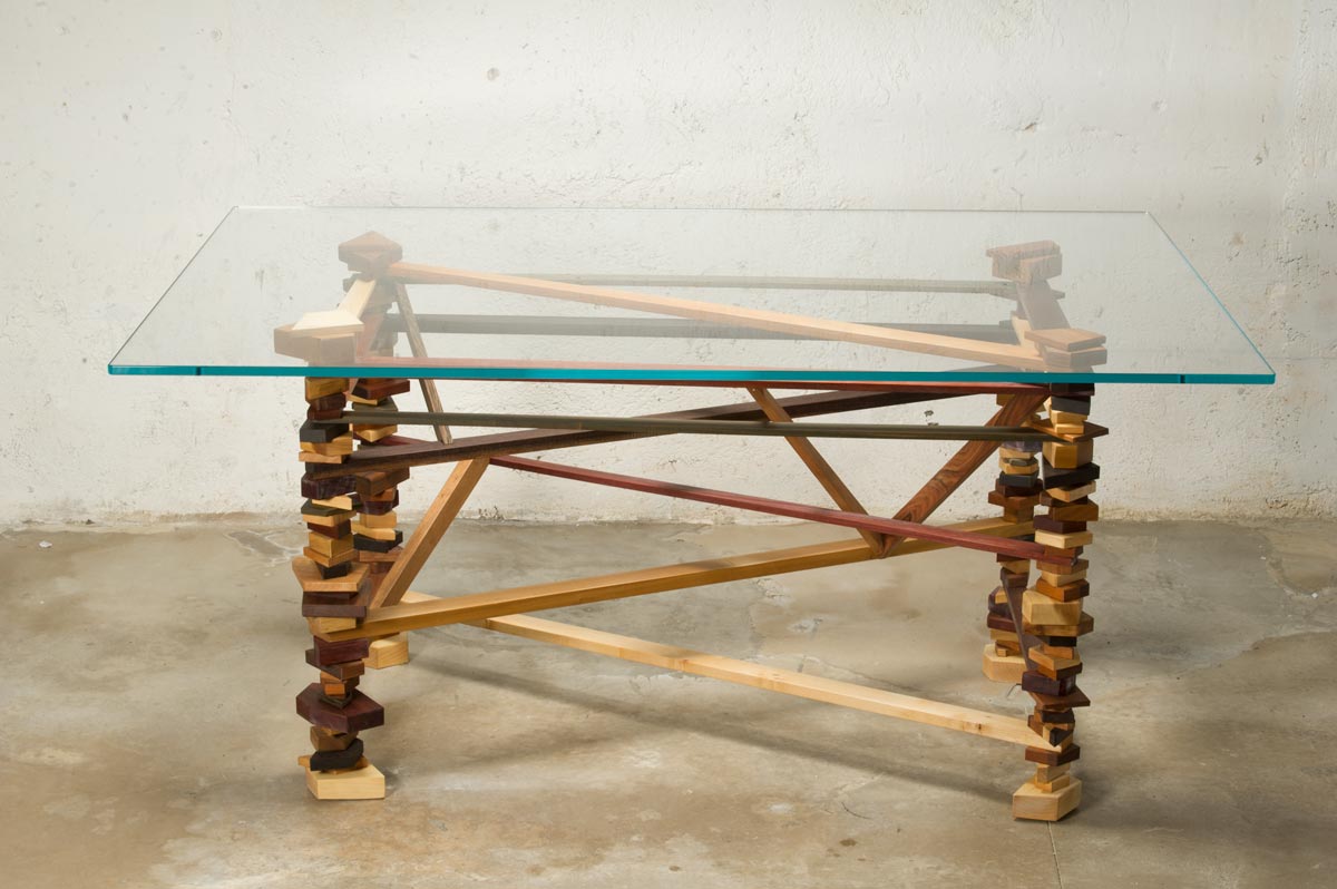 Tecniche e materiali del passato, trovano nuove applicazioni creano textures lignee e geometrie non convenzionali. È nata cosi una serie di tavoli con i piani composti da schegge e frammenti di legno massello nuovo nel suo tono naturale: con tasselli da combinare con infinite possibilità per creare opere uniche e irripetibili.