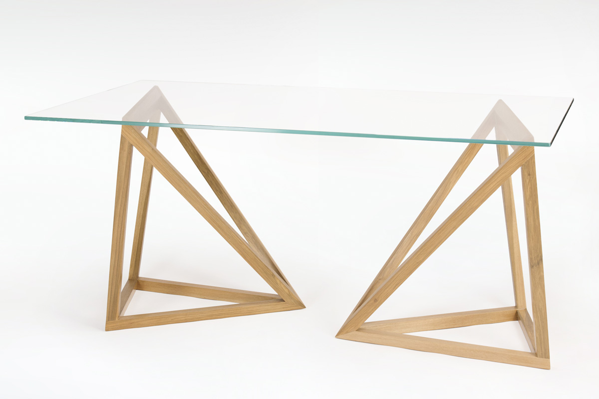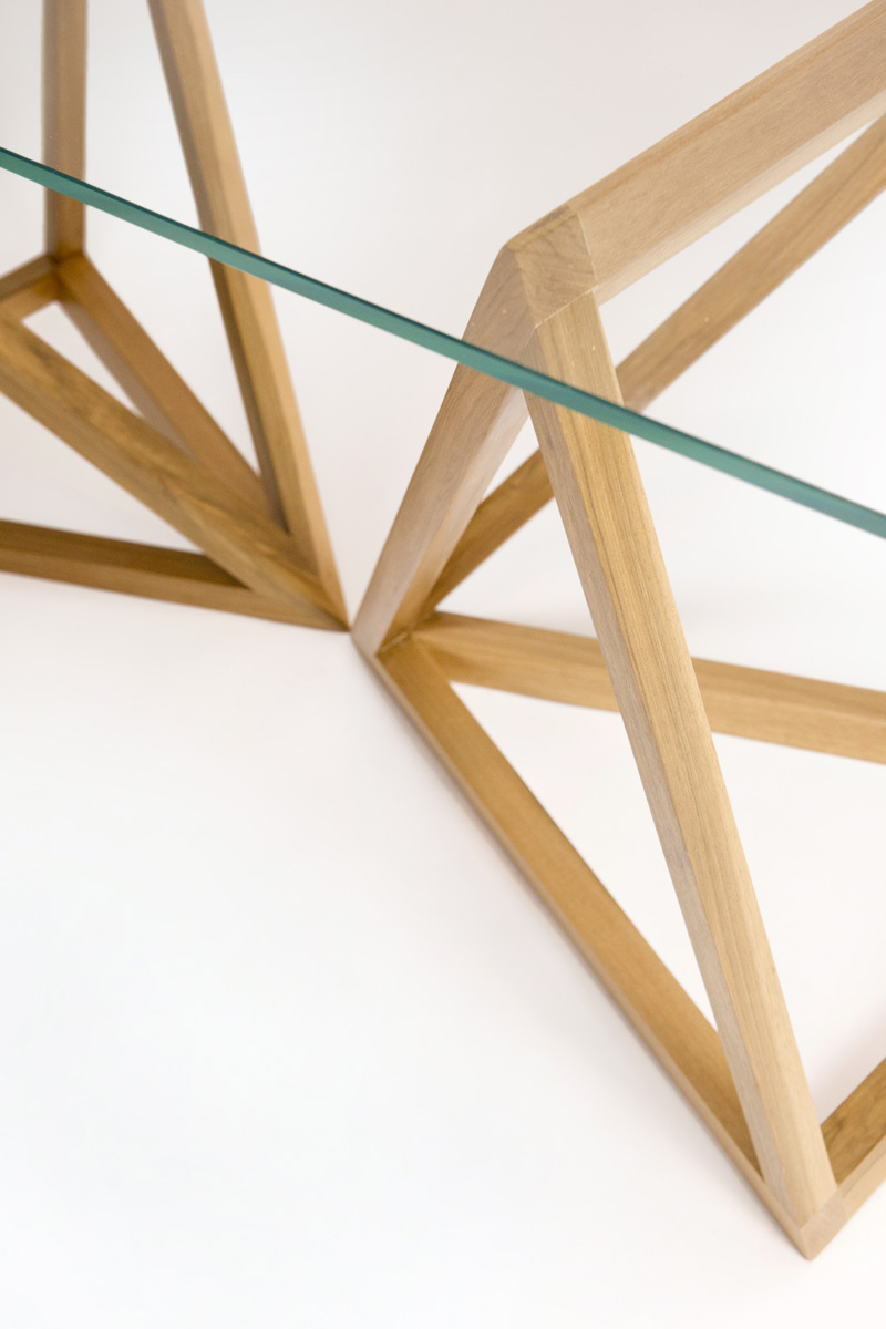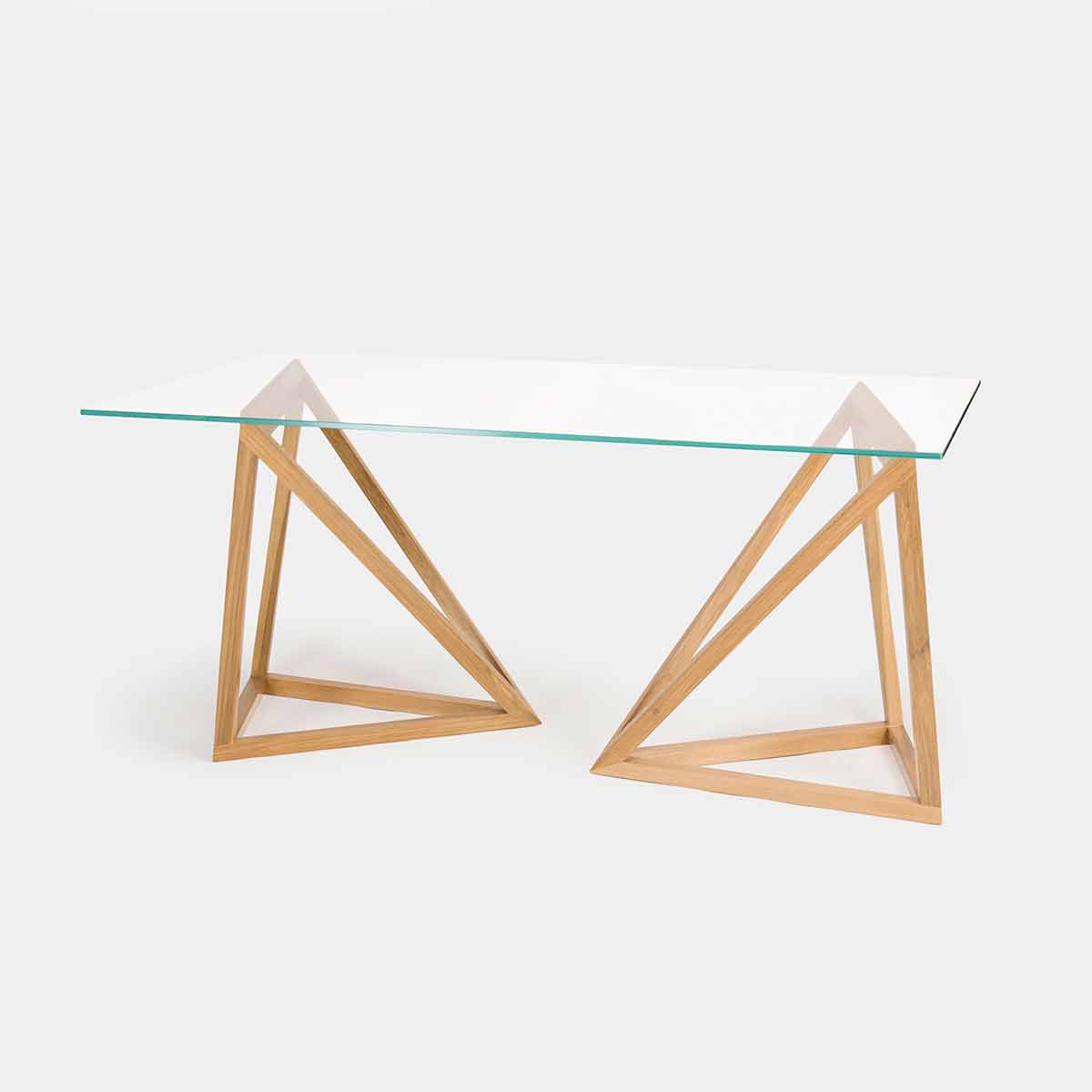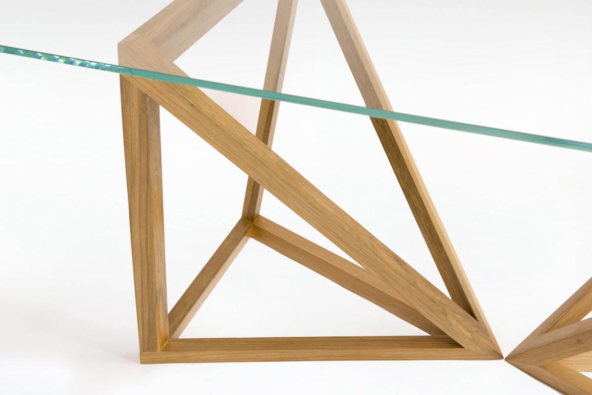La materializzazione asciutta di un disegno in 3D: poche, semplici linee geometriche realizzate in massello di rovere. Il piano in cristallo è sorretto da due identiche piramidi irregolari.