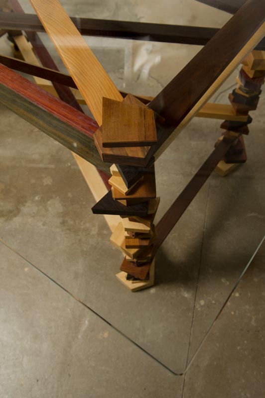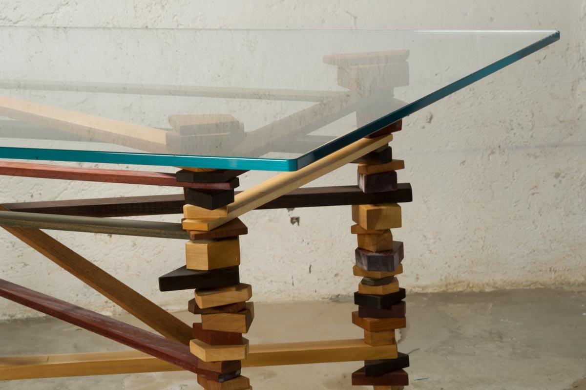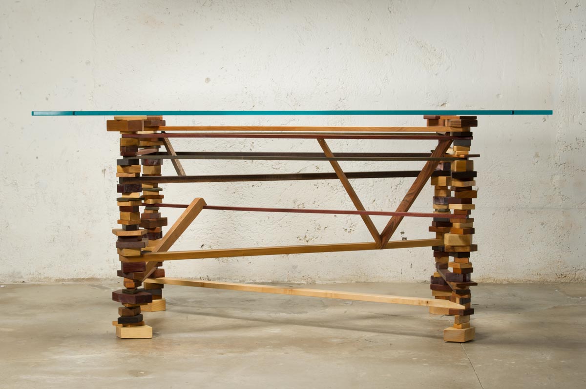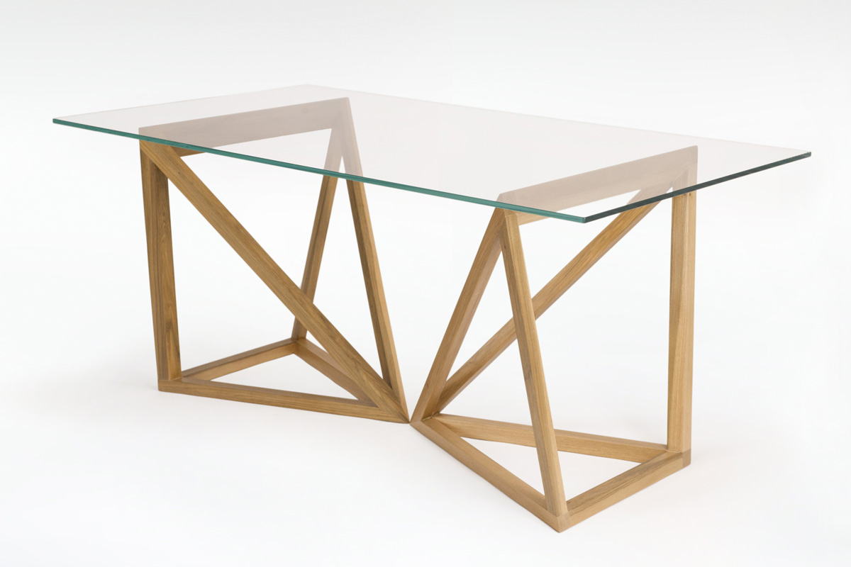 La materializzazione asciutta di un disegno in 3D: poche, semplici linee geometriche realizzate in massello di rovere. Il piano in cristallo è sorretto da due identiche piramidi irregolari.