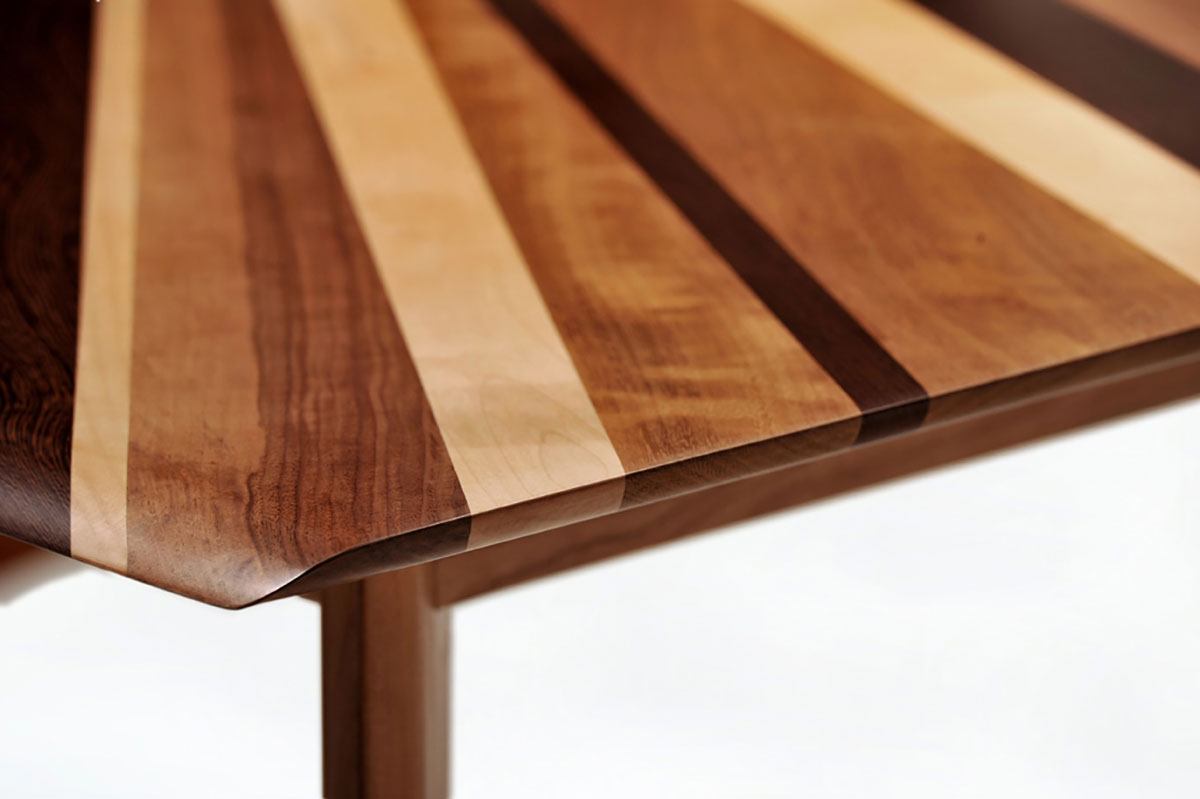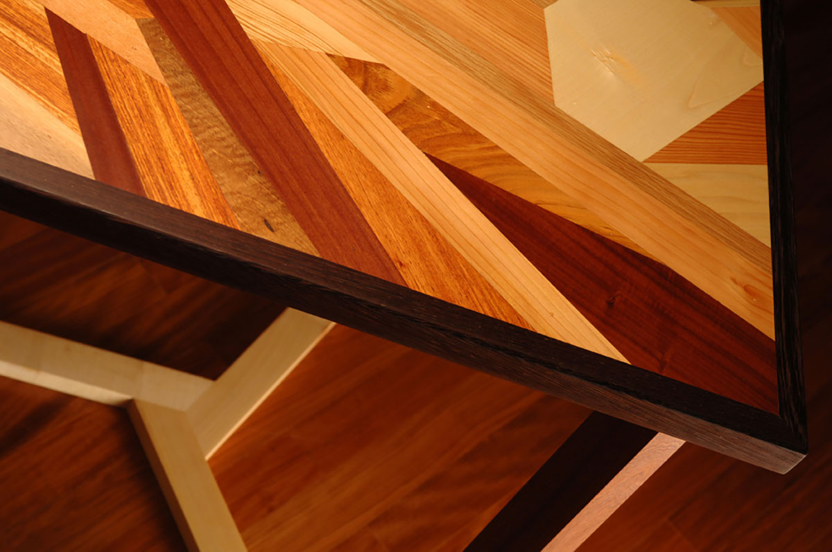 L’arte dell’intarsio fa parte delle lavorazioni classiche e tradizionali della falegnameria. Questa tecnica consiste nell’incollare su di un pannello del legno massello di basso spessore (dai 4 ai 10 mm ) di essenze diverse per creare grafismi e giochi cromatici sulle superfici. I piani dei tavoli sono ottime superfici su cui sperimentare l’intarsio con un gusto contemporaneo creando mosaici in stile libero.